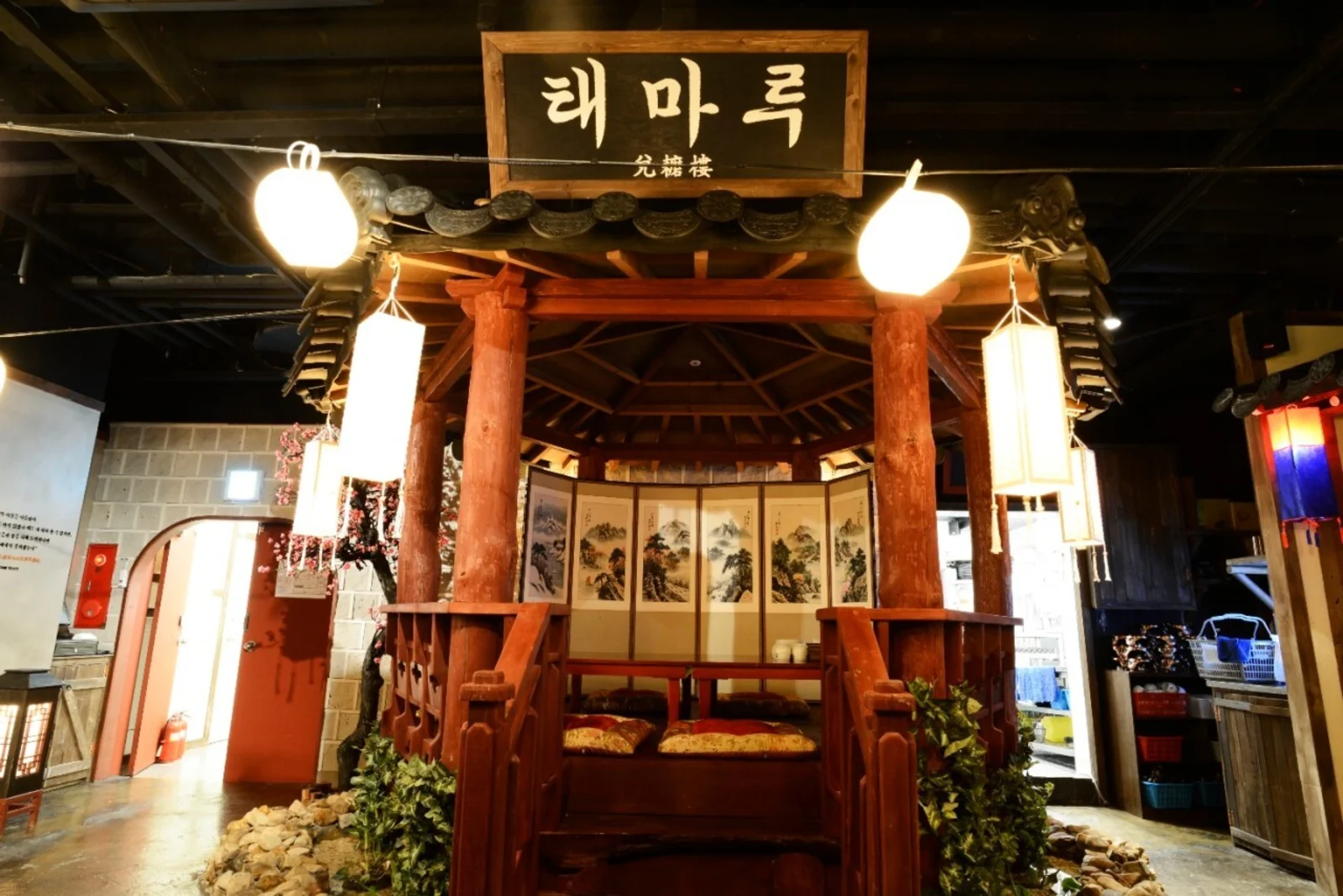 店内は朝鮮時代の村を再現したようなデザインで、提灯が吊るされた天井や細部にまでこだわった装飾が訪れる人々を魅了します。座敷やテーブル席があり、テーマルームでは特別な時間を過ごすことができます。